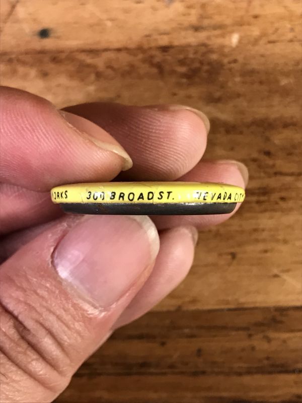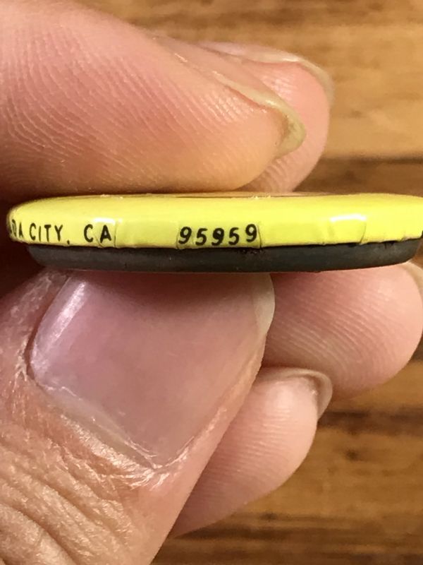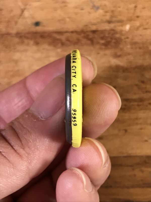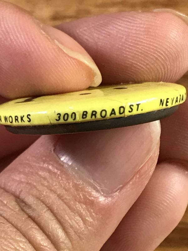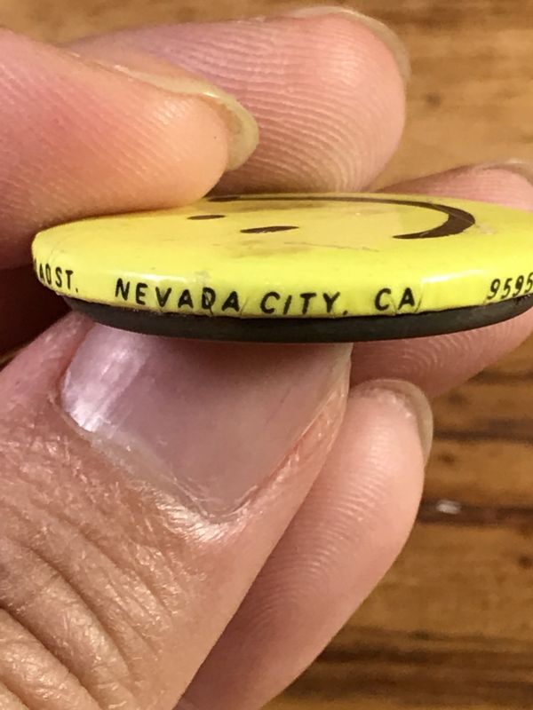 横面にBUTTON WORKS 300 BROADST. NEVADA CITY.CA 95959の文字が入っているスマイルの缶バッジです。