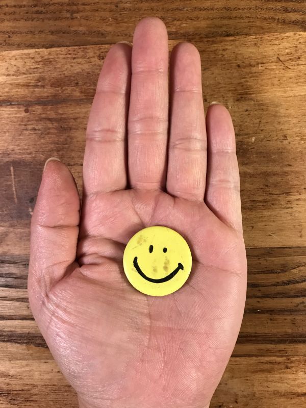 70年代頃のスマイルフェイスの金属製の缶バッジになります。
