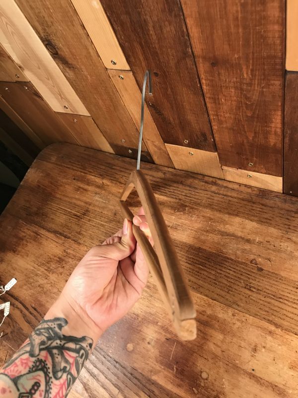アメリカのクリーニング店で使用されていたパンツなども掛けられる下のバーがついたタイプのウッドハンガーです。