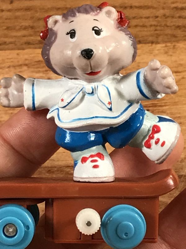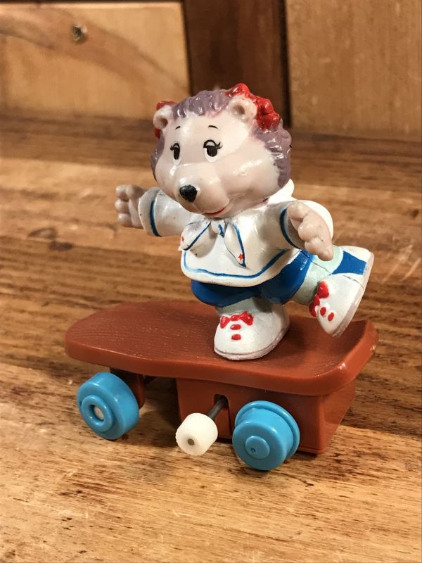 アメリカングリーティングズ社のおもちゃのデザインとライセンス部門である「クリーブランドキャラクターズ」の1983年に作成された擬人化された動物のキャラクター“ゲットアロングギャング”のヤマアラシの女の子“ポーシャポーキュパイン”のゼンマイ式の乗り物付きのPVCフィギュアです。
