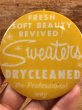 “Fresh Soft Beauty Revived!Sweaters Drycleaned The Professional Way”(新鮮な柔らかい美しさは蘇った!プロフェッショナルな方法でセーターをクリーニングします)と書かれたクリーニング店の広告の大き目サイズの缶バッチです。