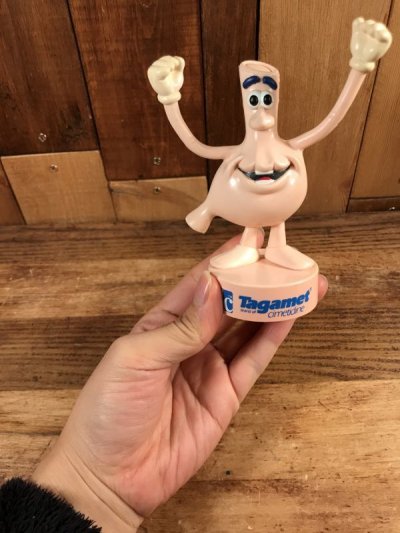 アメリカの胃薬品の企業キャラクター“タガメット”の台付きの体の中に針金が入っていて曲げることができるディスプレイ人形です。