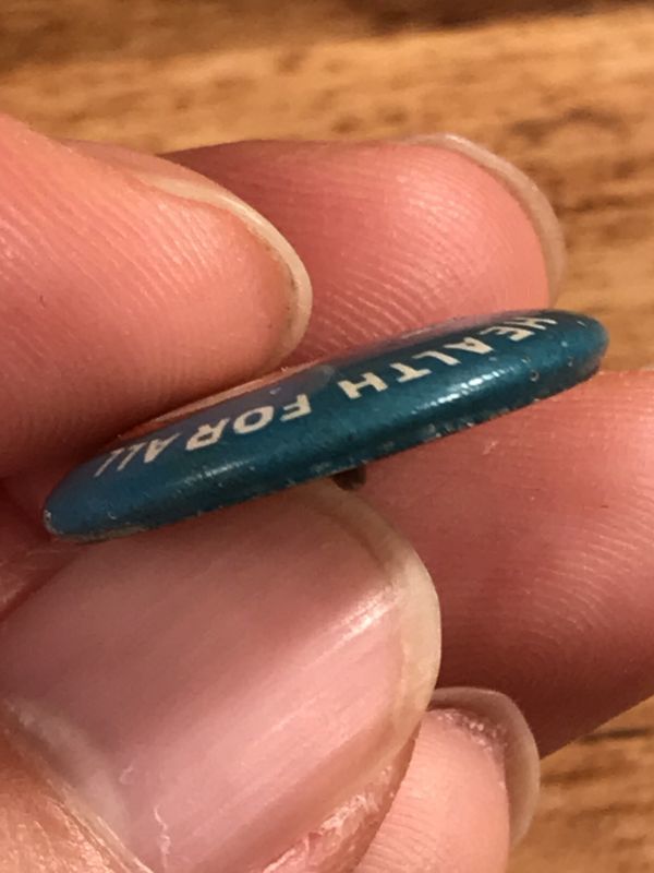 2条の十字架のマークのサンタクロースと“Health For All”(すべての人の健康)が描かれた針が飛び出たタイプの小さめの缶バッチです。