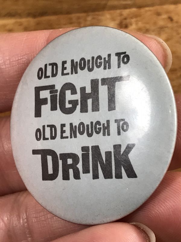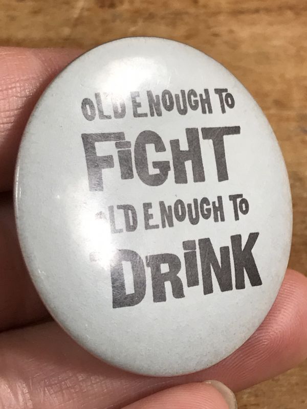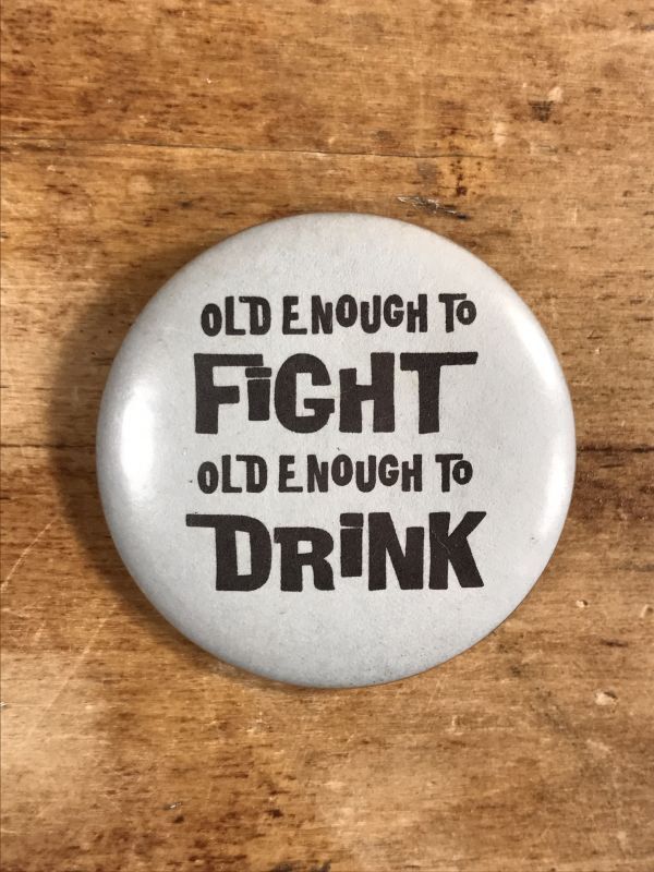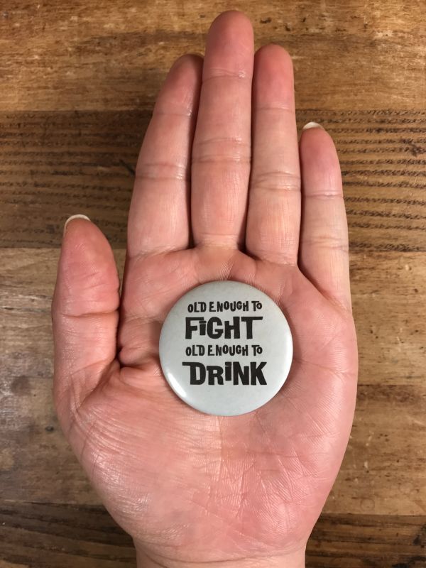 “Old Enough To Fight Old Enough To Drink”(戦う年ごろ飲める年ごろ)のメッセージが書かれた缶バッチです。