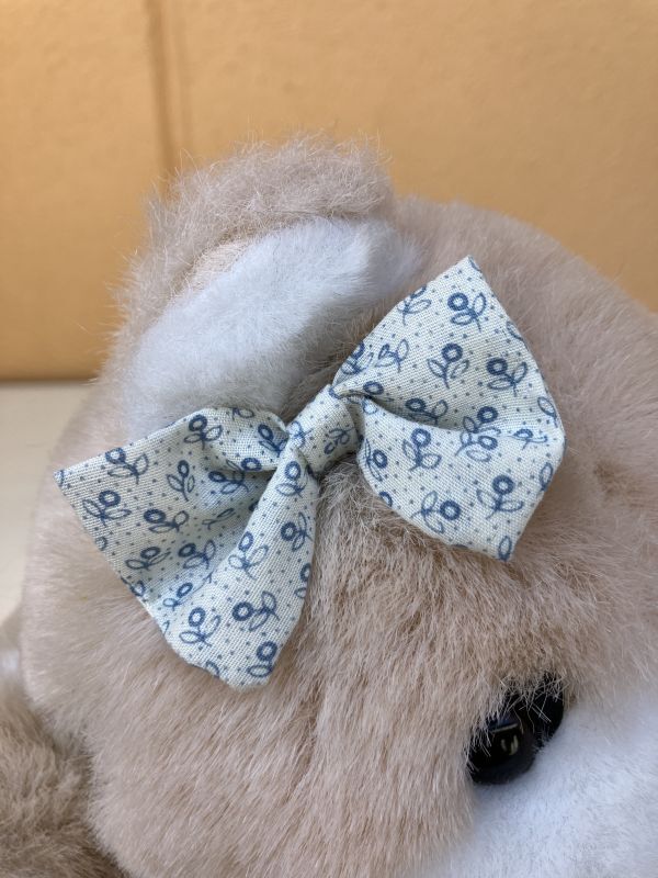 耳に青い花柄のコットンリボンが付いており、ミルクティーのような色味のふわふわの毛並みがかわいいくまの女の子のぬいぐるみです。