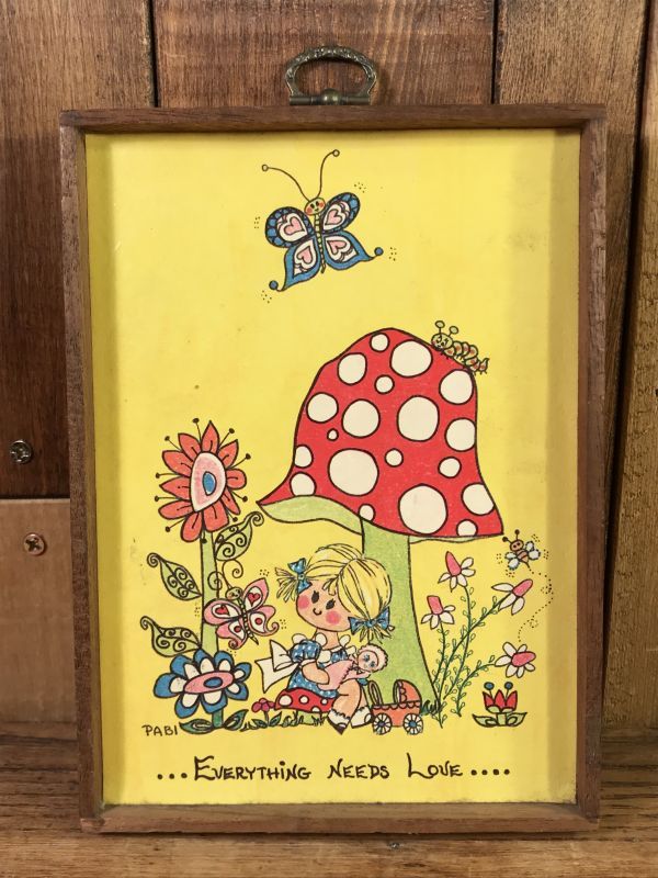 女の子とキノコ、蝶々にフラワーと「Everything Needs Love」(すべてが愛を必要とします)のメッセージが描かれた小さめの壁掛けです。