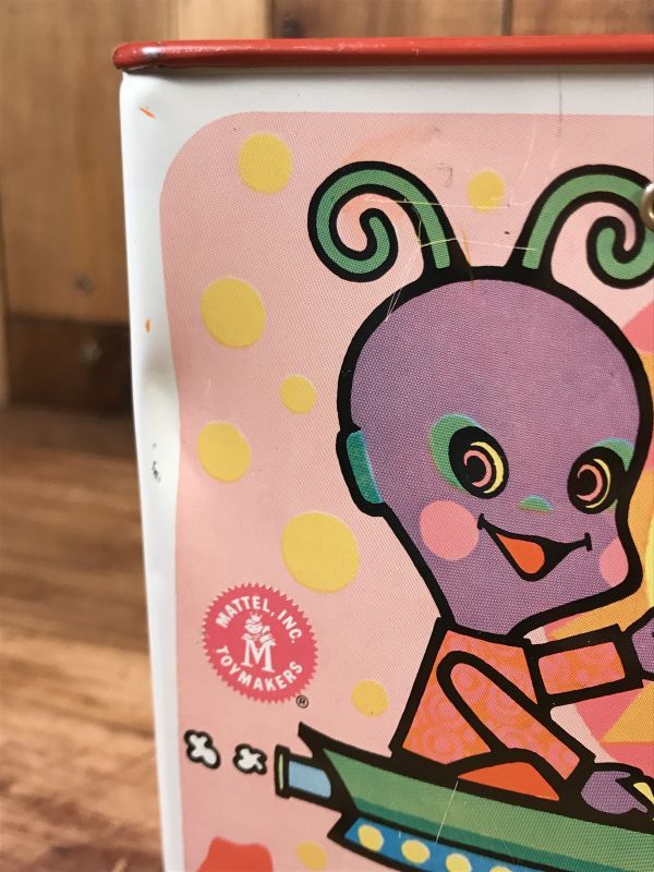 状態 経年からの汚れ、細かなキズ、ペイントロス等多少ありますが比較的綺麗な状態です。ボックスの正面の左上部分に若干へこみがあります。触角の部分の根元に若干ヒビがあります。フタを閉じてハンドルを回すと音は鳴りますが、箱からドールが飛び出ません。