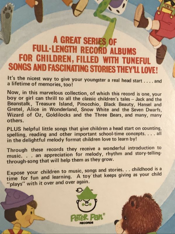 カバーは紙製で6つの物語(ピーターパン、ジャックと豆の木、パンドラの箱、親指トム、アリババと40人の盗賊、ハーメルンの笛吹き男)が入ったLP盤です。