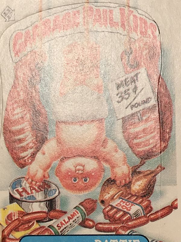 80年代頃のTopps社製ガーベッジペイルキッズ「Hamburger Pattie」の紙製ステッカーカードになります。