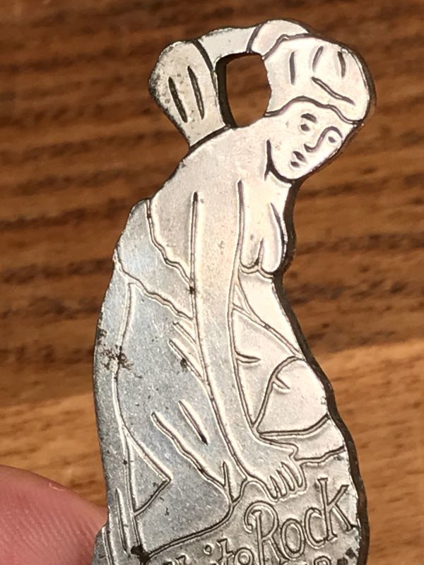 アメリカのジンジャーエールソーダの銘柄“White Rock”の女神が描かれたメタル製の栓抜きです。
