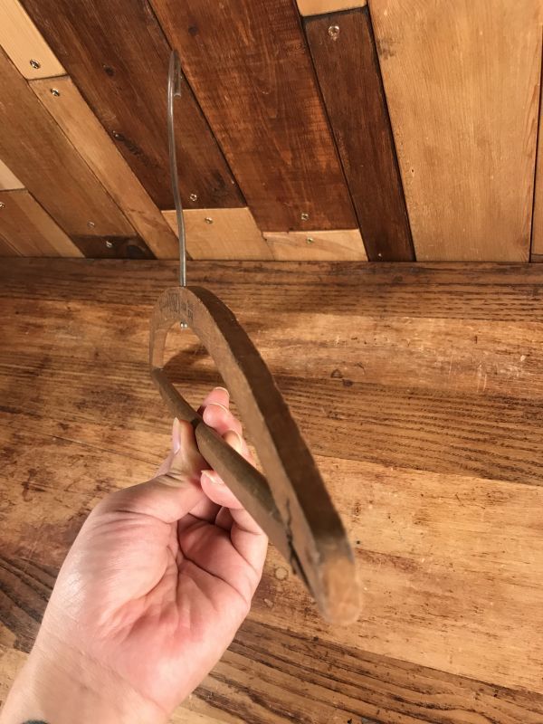 アメリカのクリーニング店で使用されていたパンツなども掛けられる下のバーがついたタイプのウッドハンガーです。