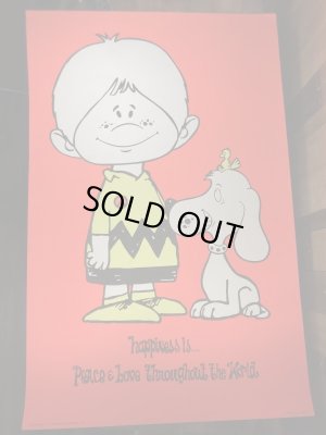 チャーリーブラウン似の男の子の胸にはピースマークが付いていて“Happiness Is... Peace & Love Throughout The World”(幸せは...全世界の平和と愛)のメッセージが書かれています。