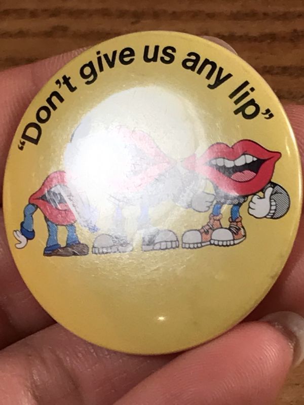 アメリカの食品メーカー「ゼネラルフーズ」の企業キャラクター“タンリップス”の「Don't Give Us Any Lip」(私たちにどんな唇をも与えないでください)のメッセージが書かれている缶バッチです。