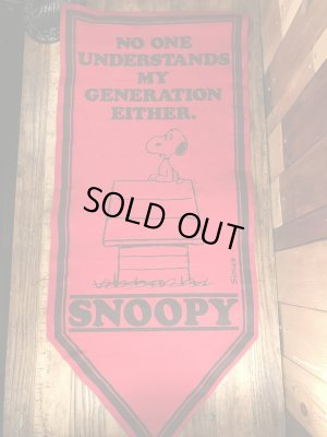 “No One Understands My Generation Either.”(誰も、私の世代を理解しません)のメッセージとスヌーピーが描かれたフェルトのタペストリーバナーです。