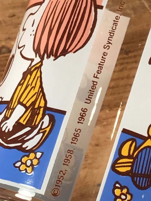 ファイヤーキングなどで有名なアンカーホッキング社製のスヌーピーとピーナッツギャングたちが描かれたビッググラスです。