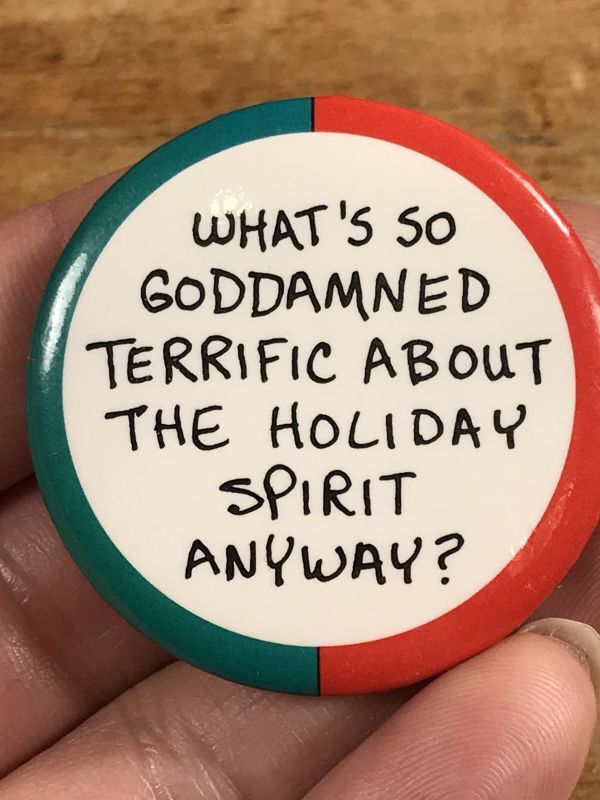 “What's So Goddamned Terrific About The Holiday Spirit Anyway?”(とにかく休日気分について何がそんなにすごいのか?)のメッセージが書かれた缶バッチです。