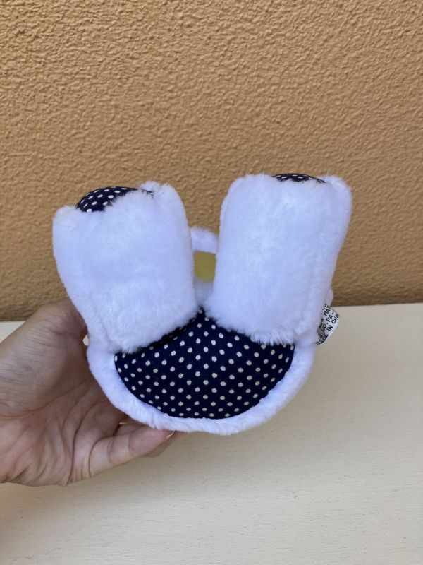目と鼻はプラスチック製パーツ、耳と手足にネイビーのピンドット柄の生地が使用されています。